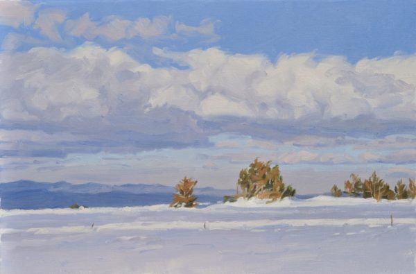 Elle saisit la présence du corps de la montagne, comme la manifestation du silence d’hiver. Il suffit de regarder un chemin, quelques arbres, et les fermes ballottées dans le froid, pour comprendre que le tableau est un accès à ce qui existe avant sa représentation. Son travail est révélation et témoignage de ce qui se donne si l’on s’y arrête. Ce don, elle sait l’attendre, l’accepter, remercier et célébrer l’ampleur du lointain ; mais aussi dire sa gratitude à l’égard du plus près, de l’incessante métamorphose des champs, des labours et des arbres. Ses œuvres donnent à voir humblement, et grâce à elle nous voyons.
